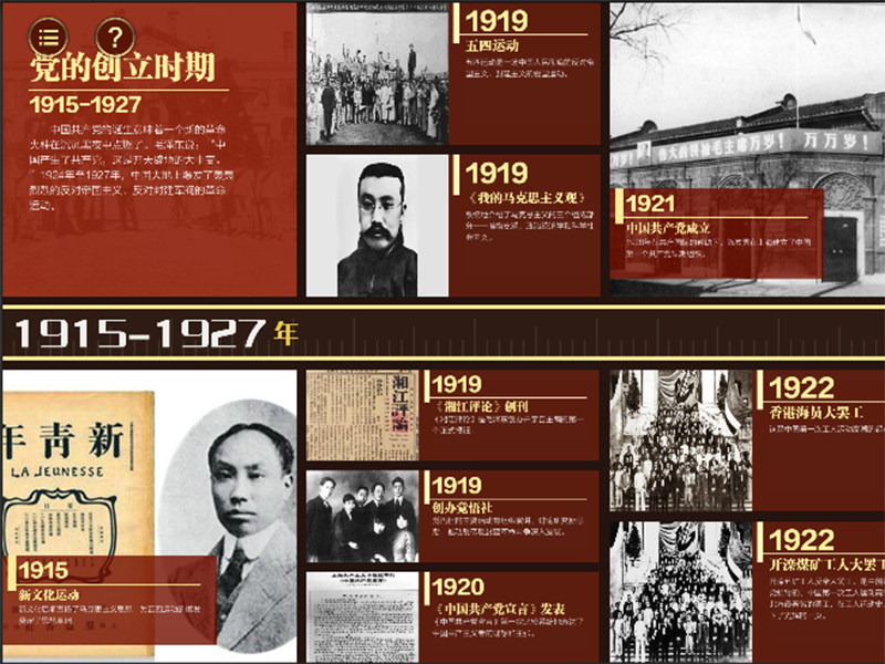 "学史增信”四史时间轴系统采用触摸显示屏,支持多点触摸。软件以党史、国史、改革开放史、社会主义史作为内容,采用素材文件夹作为后台更新资 料的方式,是一款专门为党