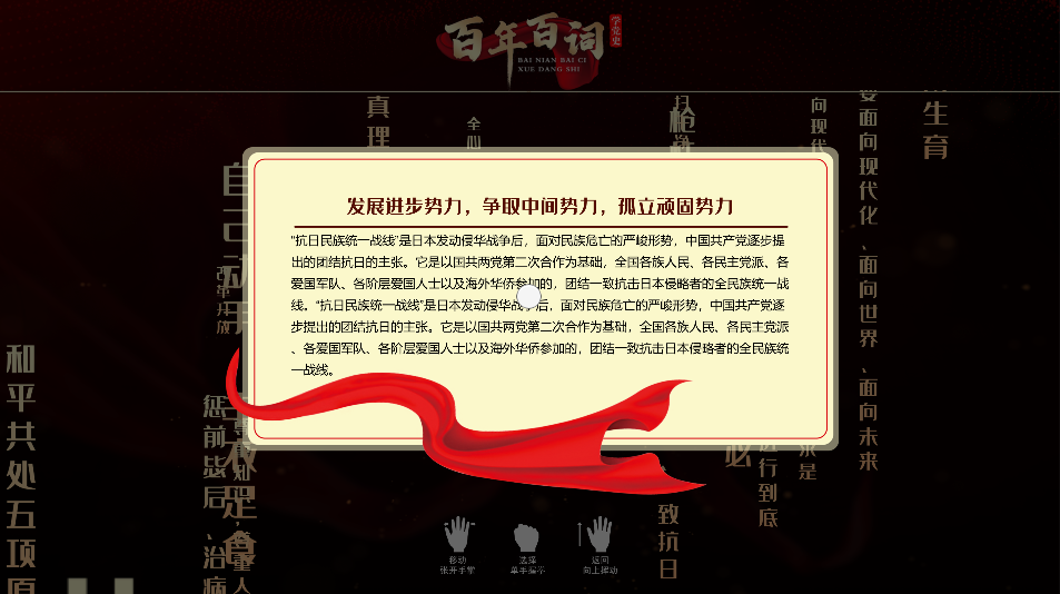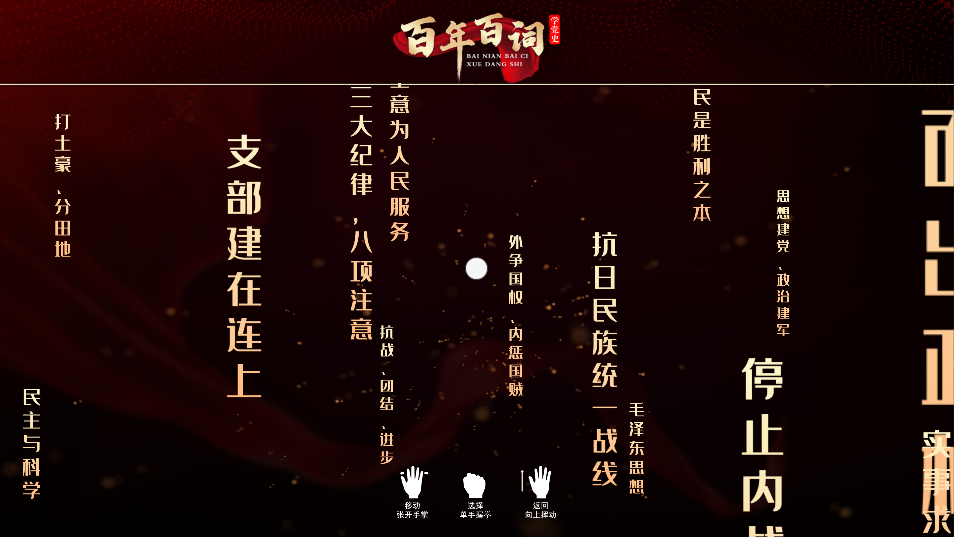 “百年百词学党史”互动展项采用Leap Motion体感控制的方式展现如“一国两制”、“九二共识”、“四个全面”等一百个带有鲜明时代印记的词句。带领用户回顾党的伟大历程和伟大成就,汲取奋进前行的力量。